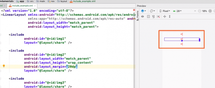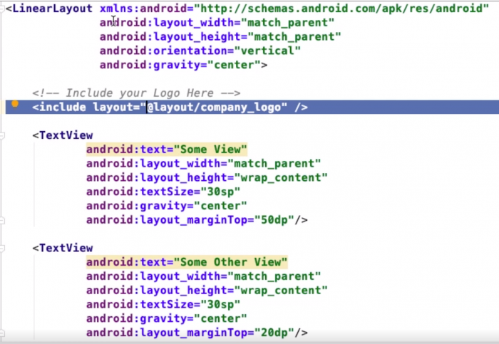 Sometimes when we include files they already have a layout as a parent. We can use the Merge tag to combine the layout instead. This makes the children become child of the parent layout rather than the LinearLayout (in this case) be embedded.