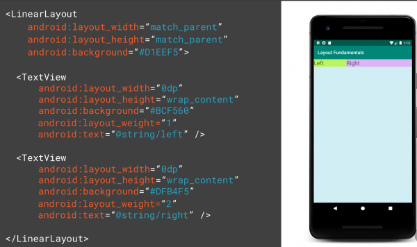 Weight determines the distribution of the widgets when no width or height is provided. Here the weight adds up to 3 and therefore the ratio is 1:2