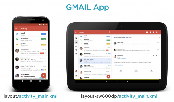 We can create layouts which meet the need to the different devices in different layout folder. For example Gmail uses a different layout on the tablet compared to the phone