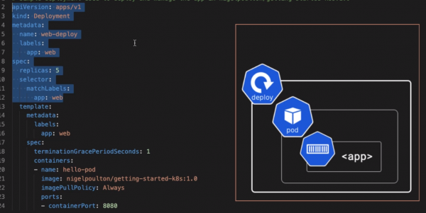 The example below show a deployment and provides and overview. The labels in the deployment spec must match the label in the Pods spec. The always is for security and ensures the code not the local copy.