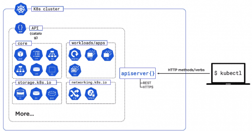 This is the API which exposes and RESTFul API. It exposes the various objects handles the requests. The objects are broken up into various sub categories. We use the command line kubectl to control this.