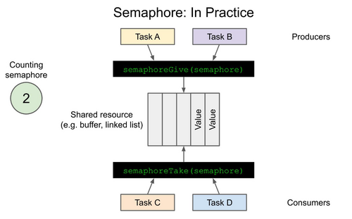 So semaphores allow more than one resource access it. Each time a producer/consumer accesses the resource the number is incremented. You still have all of the problems with updating if you use semaphores for the resource. In the example in just matters that the consumers get the event