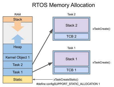 The task control block for a task holds properties about the task. e.g. Priority stack pointer. The kernel object like semaphores and queues also get allocated on the heap. There are different strategies for allocating memory in FreeRTOS depending on your needs. The demo showed mentioned