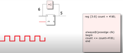 This diagram shows a d-flip flop where the input is the same as the output on a rising edge. The code only executes on a positive edge. It uses a non bloicking assignment <=